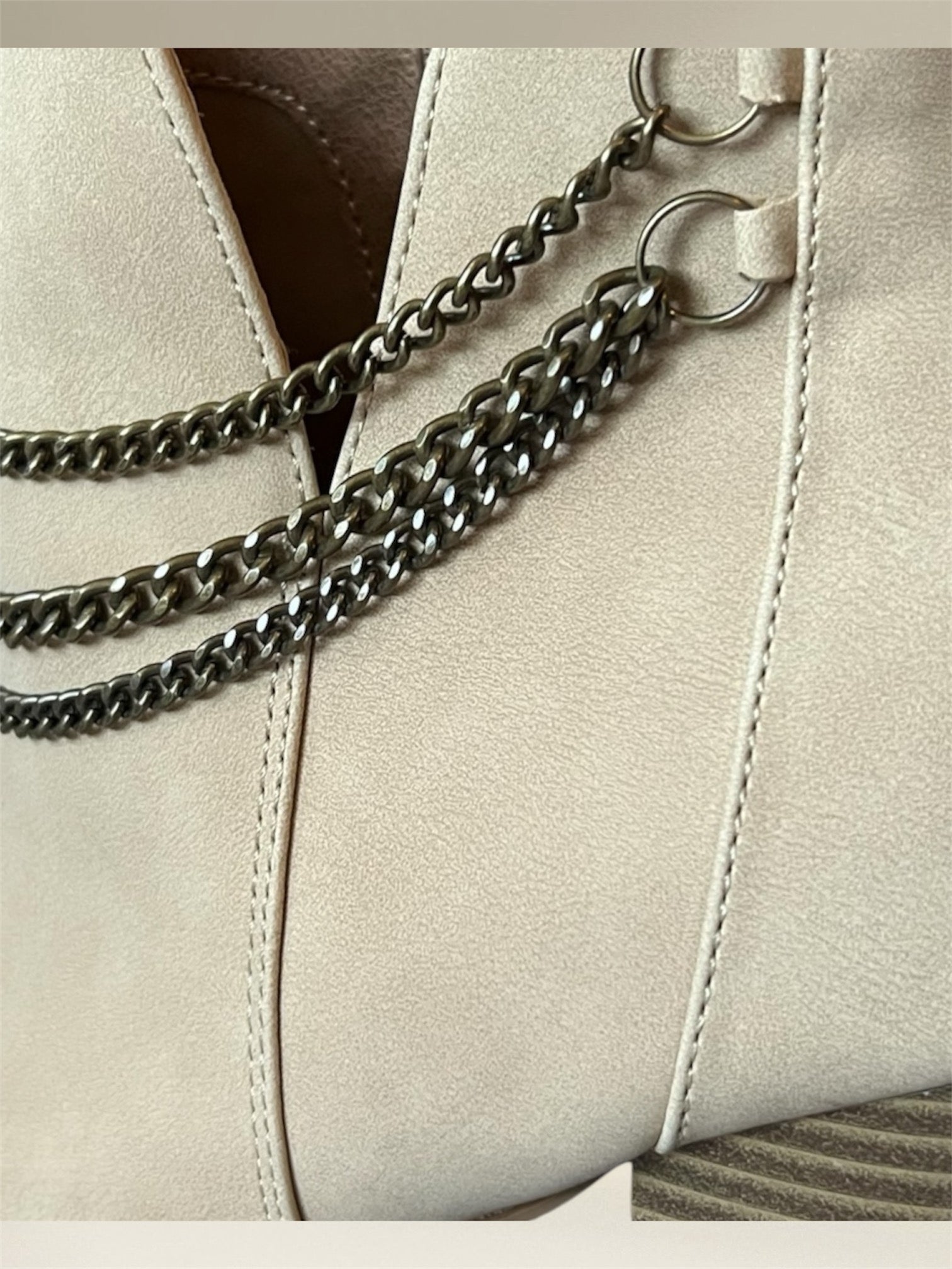 - Design: Chunky heel with chain detailing around the ankle