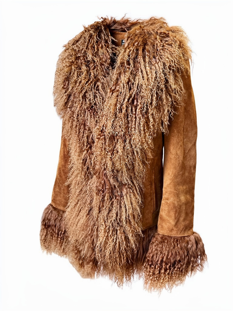 This authentic Afghan sheepskin coat is crafted from premium suede sheep leather and finished with luxurious long, curly fur trim. The textured fur detailing along the front, cuffs, and hem creates a bold, vintage-inspired silhouette while maintaining a lightweight, comfortable feel. With no inner fur lining, this coat is ideal for stylish layering in fall and winter.