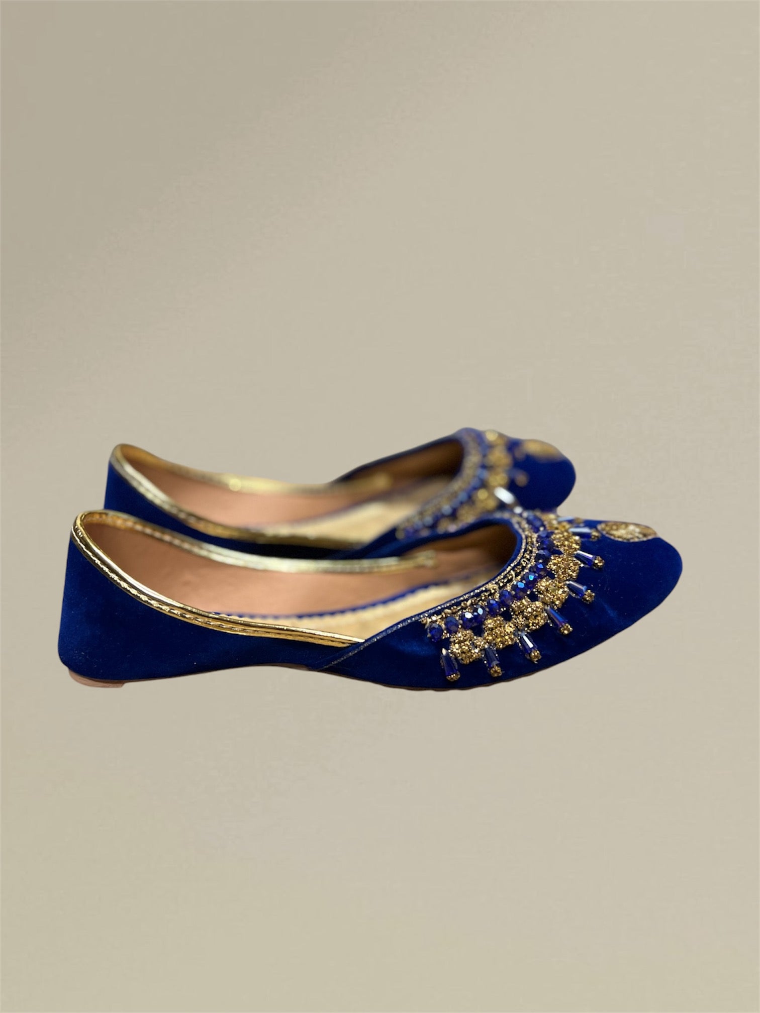 Step into timeless elegance with our luxurious velvet flats, adorned with intricate, handcrafted embroidery that features shimmering golden beads, radiant crystals, and delicate metallic threads. Each pair is a masterpiece inspired by ancient artistry, blending rich tradition with contemporary flair.